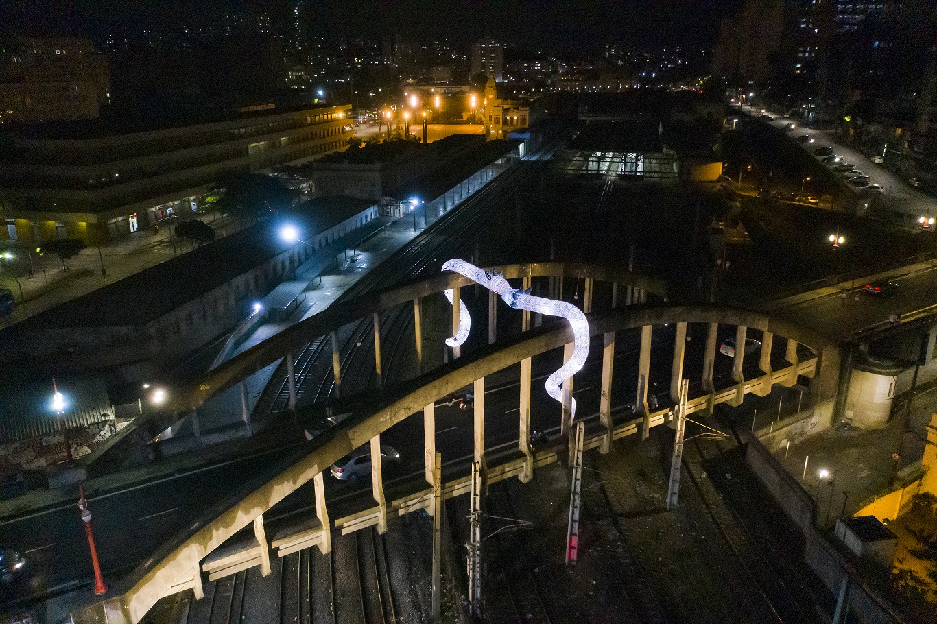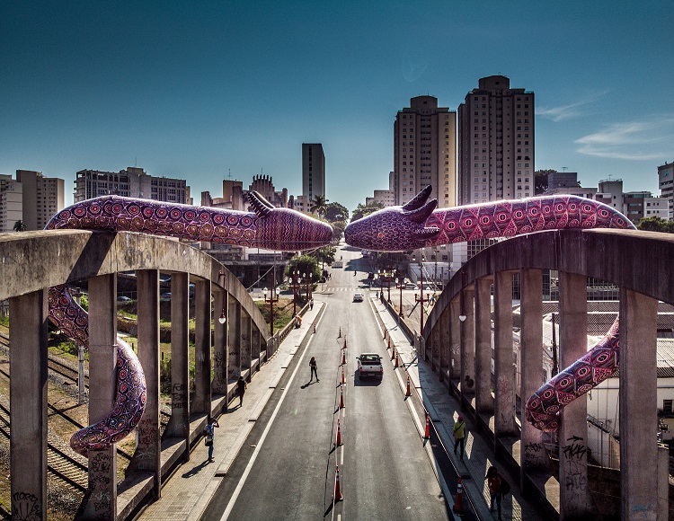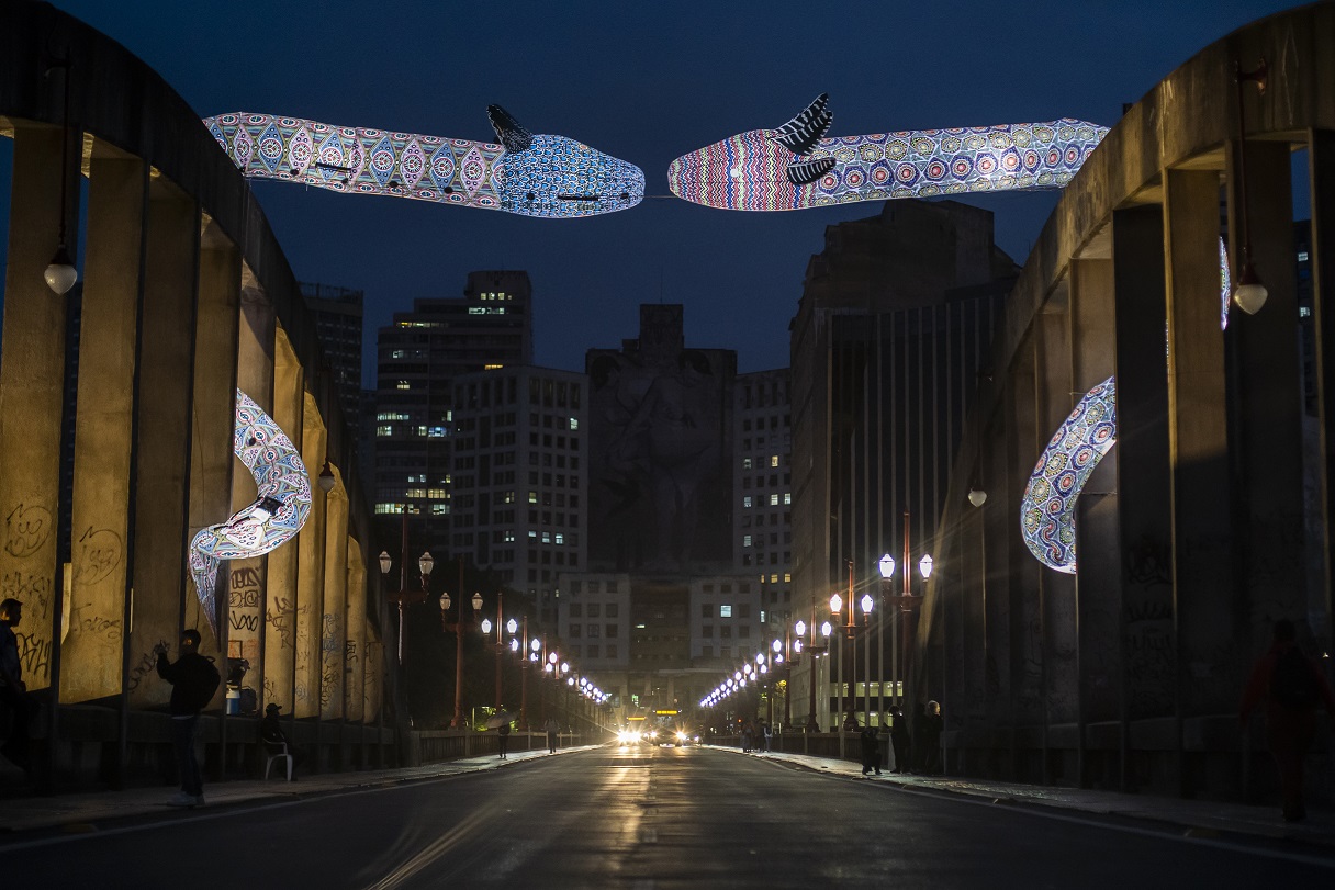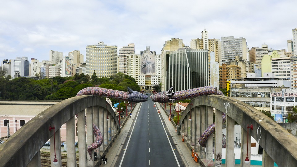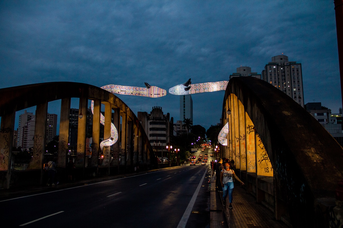 Em outubro de 2020, no Festival CURA – Circuito Urbano de Arte, você instalou a obra “Entidades” (escultura inflável com duas cobras gigantescas) sobre o tradicional Viaduto de Santa Tereza, em Belo Horizonte. O que o motivou a criá-la e qual o seu significado?