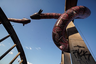 Acredito que a intolerância religiosa, que é política e cultural, foi um bom motivador. O local foi uma proposta do festival e ao ver as fotos do local as cobras apareceram na minha imaginação. As pessoas esquecem que antes de se tornarem cidades esses lugares são sagrados, pois são moradas antigas, são cemitérios, isso também me chamou a atenção. Esse viaduto é um importante cartão postal da cidade, por onde circula muita gente. Lugar também onde parte da população periférica sobrevive na invisibilidade, embaixo dele. “Moradia” propícia para o crescimento da violência e da tentativa de evangélicos dominarem mais e mais espaços. É um lugar forte, por onde sai boa parte de nossas montanhas trituradas na forma de matéria bruta e seguem para os portos em trens, numa atividade tão antiga, mas que causa danos irreversíveis ao nosso mundo. Imaginei que se eu colocasse as entidades ali, naquele ponto, seria uma forma de trazer recordações à nossa memória. Embora não consigamos ver com os olhos biológicos, sabemos que esses guardiões continuam defendendo a vida dos demais seres, como as montanhas, os campos, as florestas e os rios, por exemplo. Pela repercussão que deu, tive a certeza que foram as próprias entidades que escolheram aquele ponto para “aparecer”.