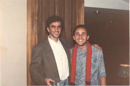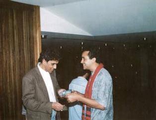 (Jovino Machado presenteia Caetano Veloso com sapatinhos de lã tricotados por sua mãe. Othon Palace Hotel, Belo Horizonte (1992). Foto: Ricardo Moebos.)